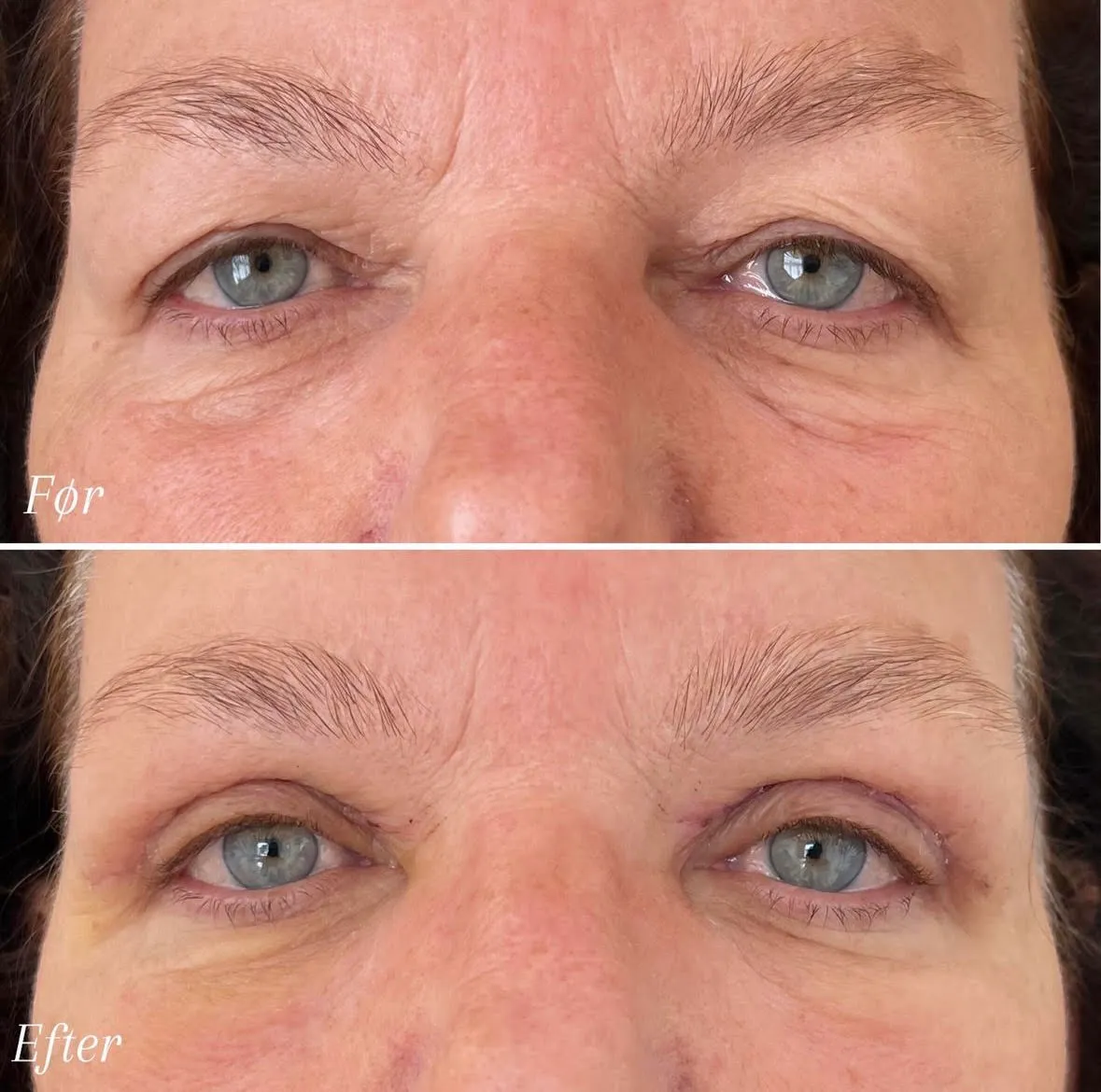 Øvre øjenlågsoperation. 48 årlige kvinde. Før og 7 mdr efter operation.