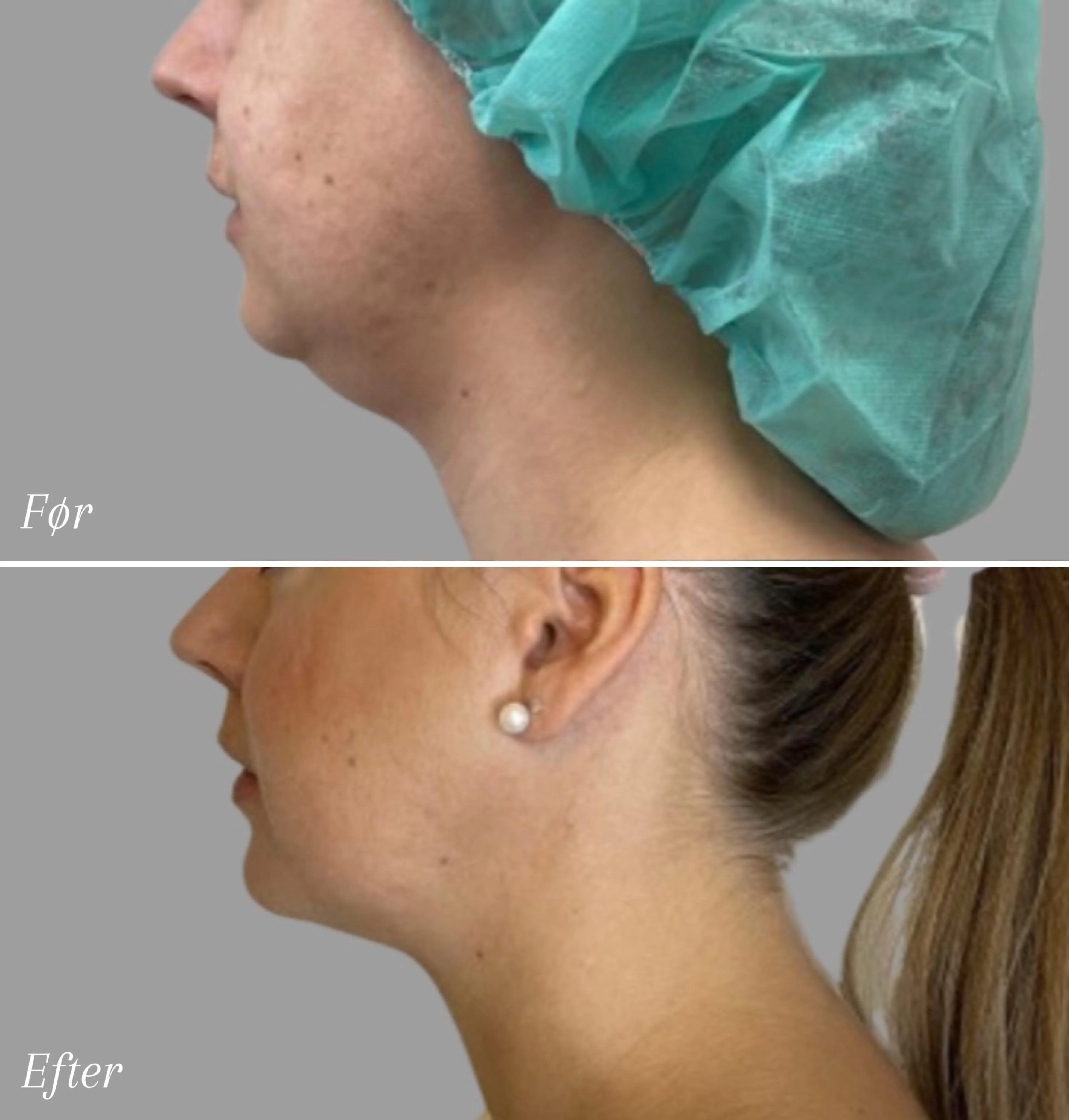 Fedtsugning af hals. 36 årlige kvinde. Suget 10 ml ren fedt. Før og 3 måneder efter.