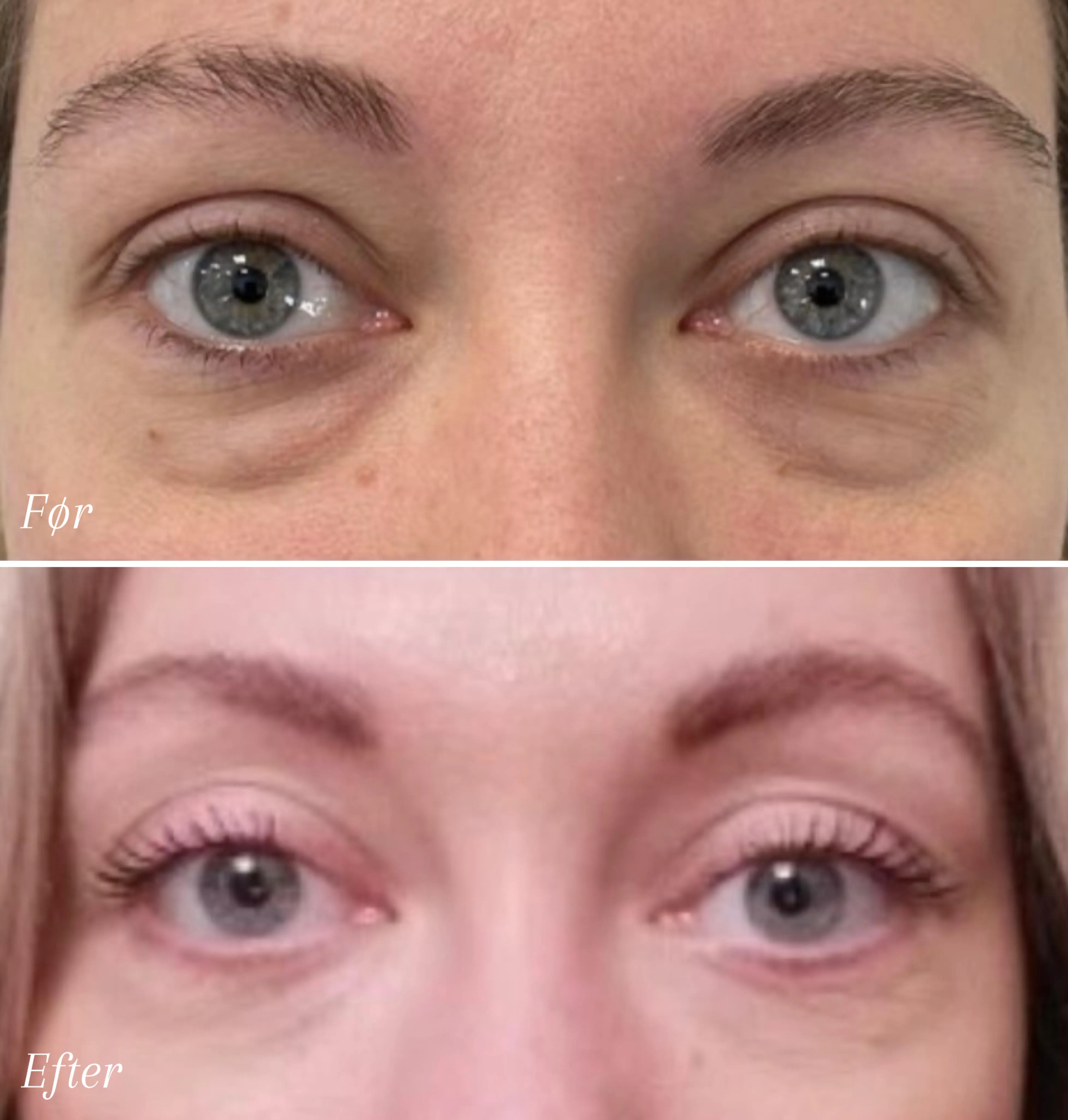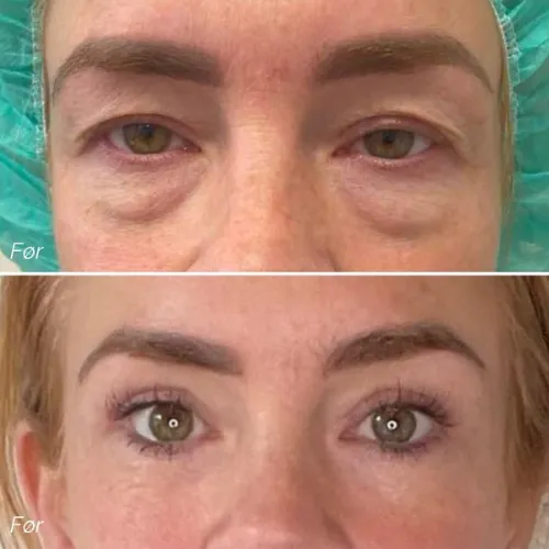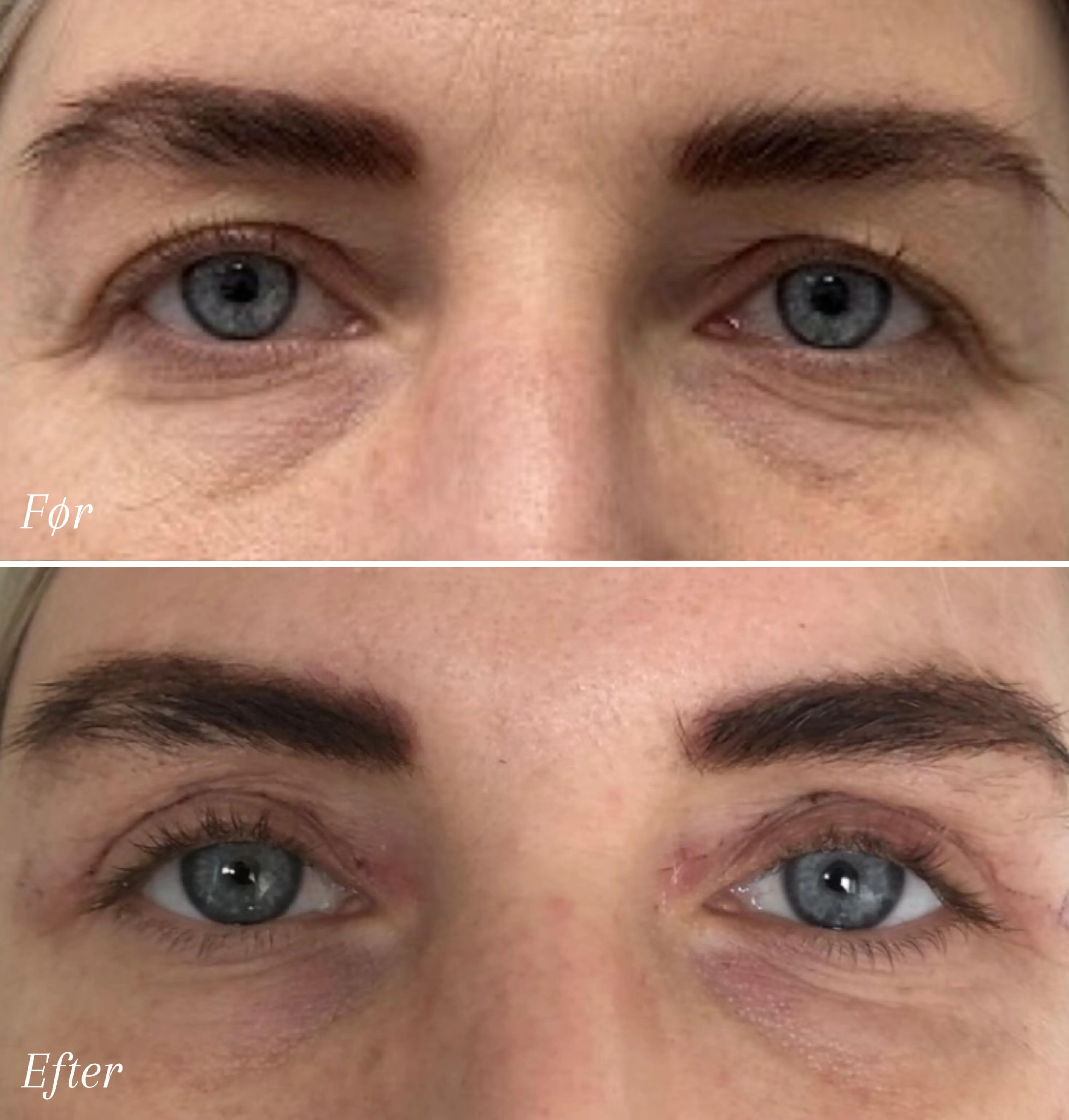 Nedre øjenlågsoperation. 30 årige kvinde. Før og 8 måneder efter operation.