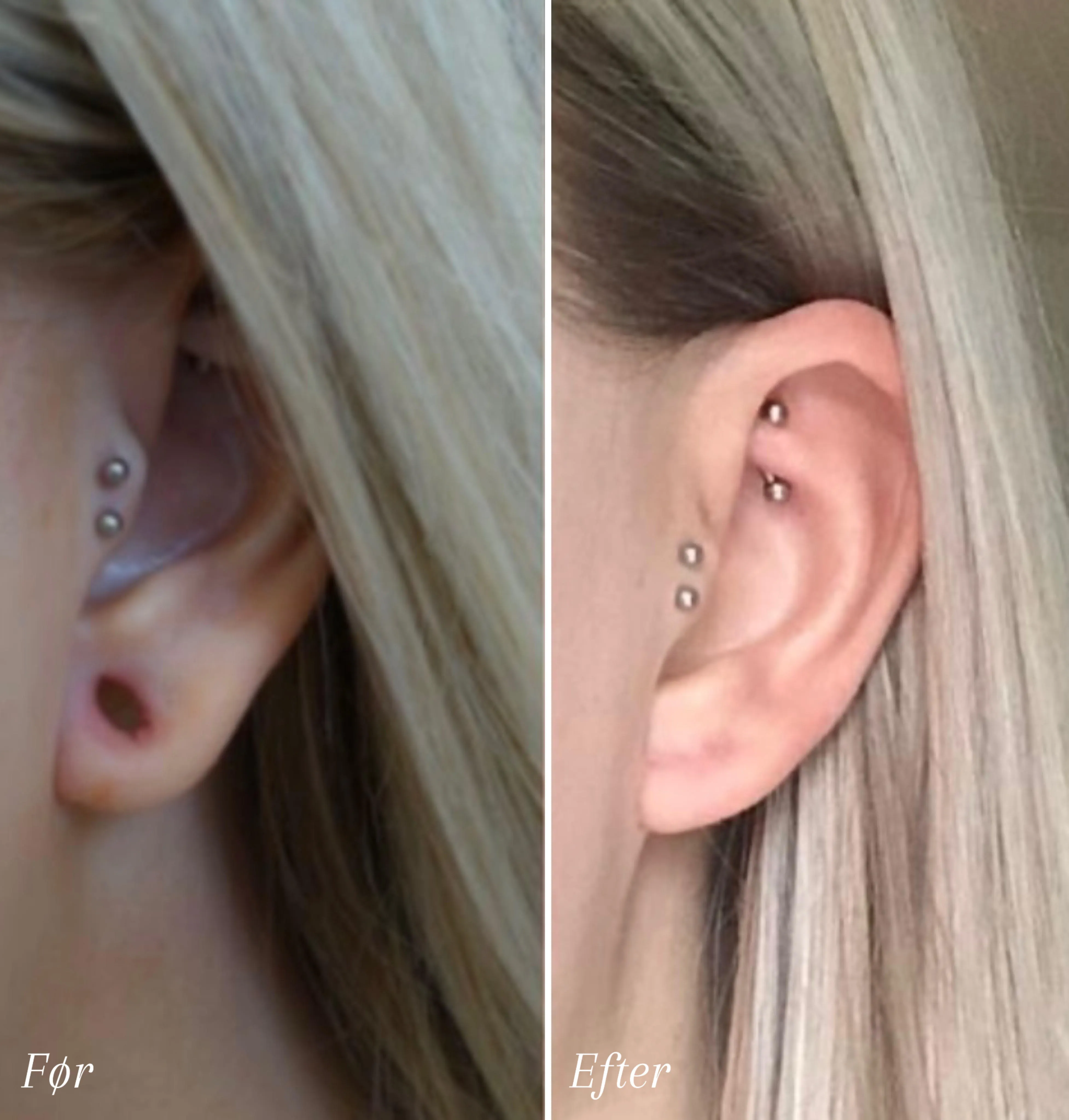 Fjernelse af stretches i ørene. 25 årige kvinde. Før og 10 dage efter operation.